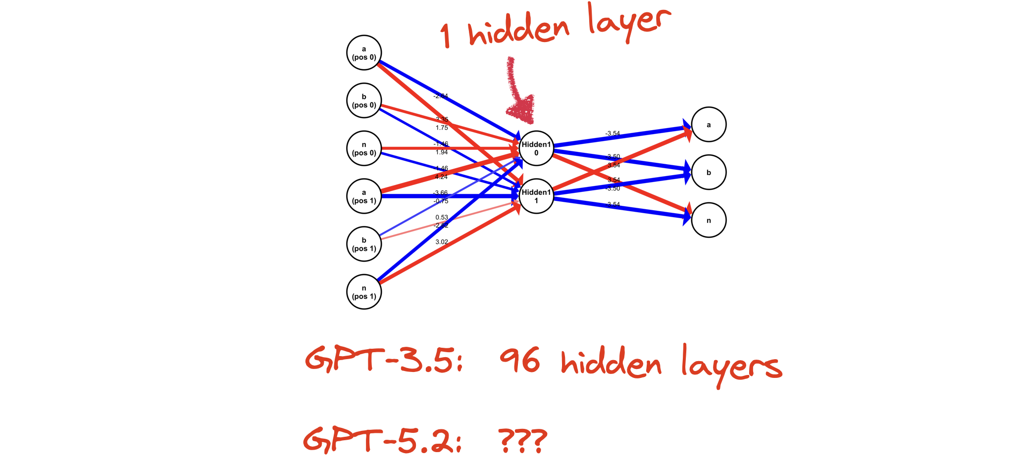 Our neural network has one hidden layer between the inputs and outputs. GPT-3.5 has 96. As AI has changed from a science experiment to a competition among businesses, they’ve become secretive, so we don’t know how many hidden layers the latest models have.