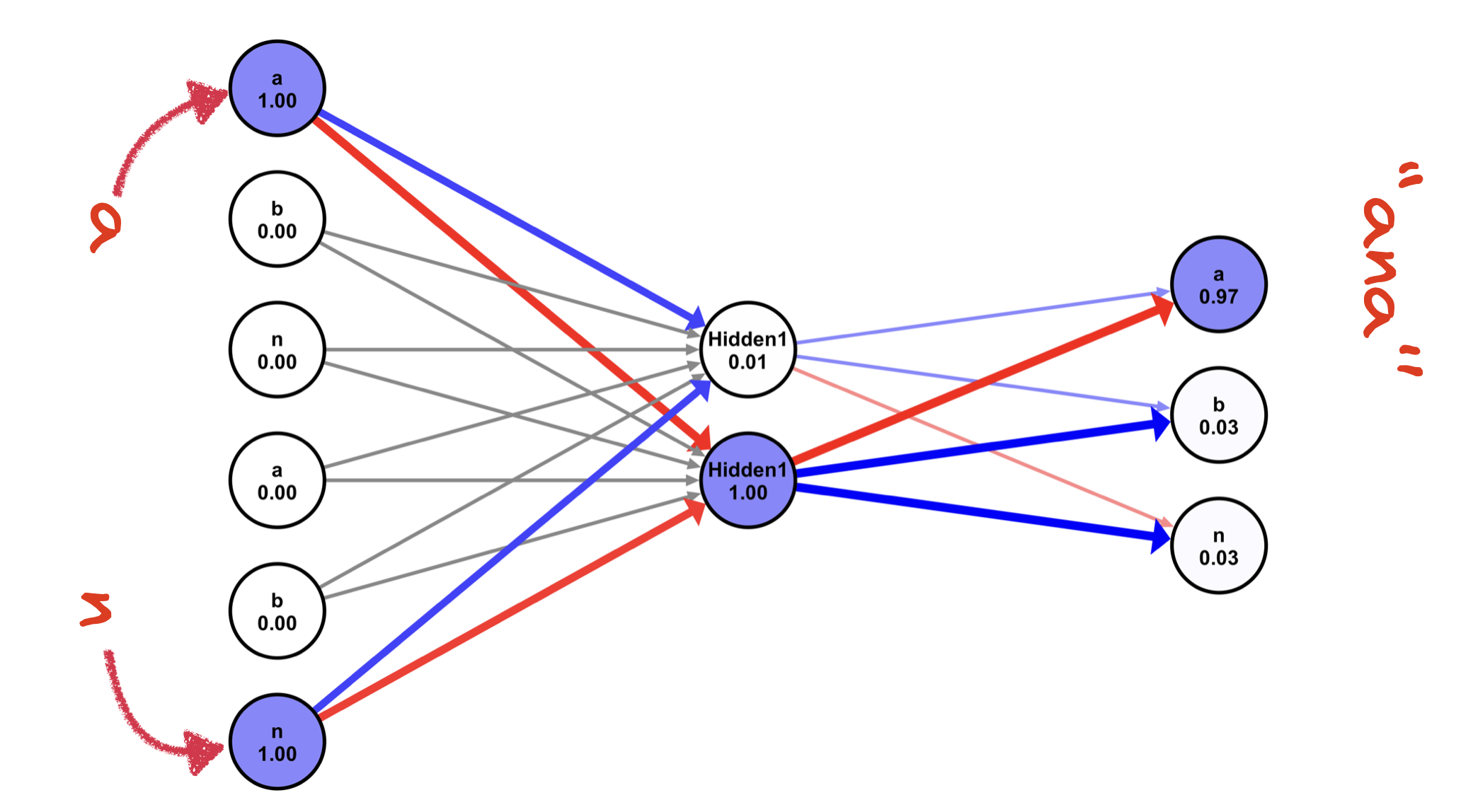 This hidden neuron suppresses the “a” and “b” outputs and excites the “N” output, so the most likely completion is “ban”. This neural net has learned how to start spelling “banana”!