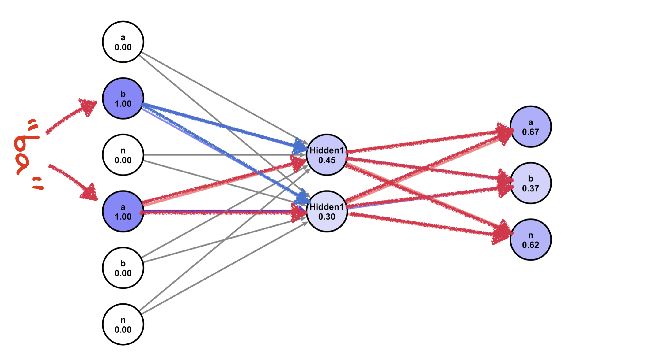 Using the neural net is called “inference”. Let’s show it the input “ba” again. That activates two input neurons, the neuropn that perceives “b” in position 0 and neuropn that perceives “a” in position 1. Those suppress the hidden neuron at the bottom, its activation is now almost zero. They excite a hidden neuron at the top, which is very excited by this combination of perceptions, its activation is 1, as excited as it can be.