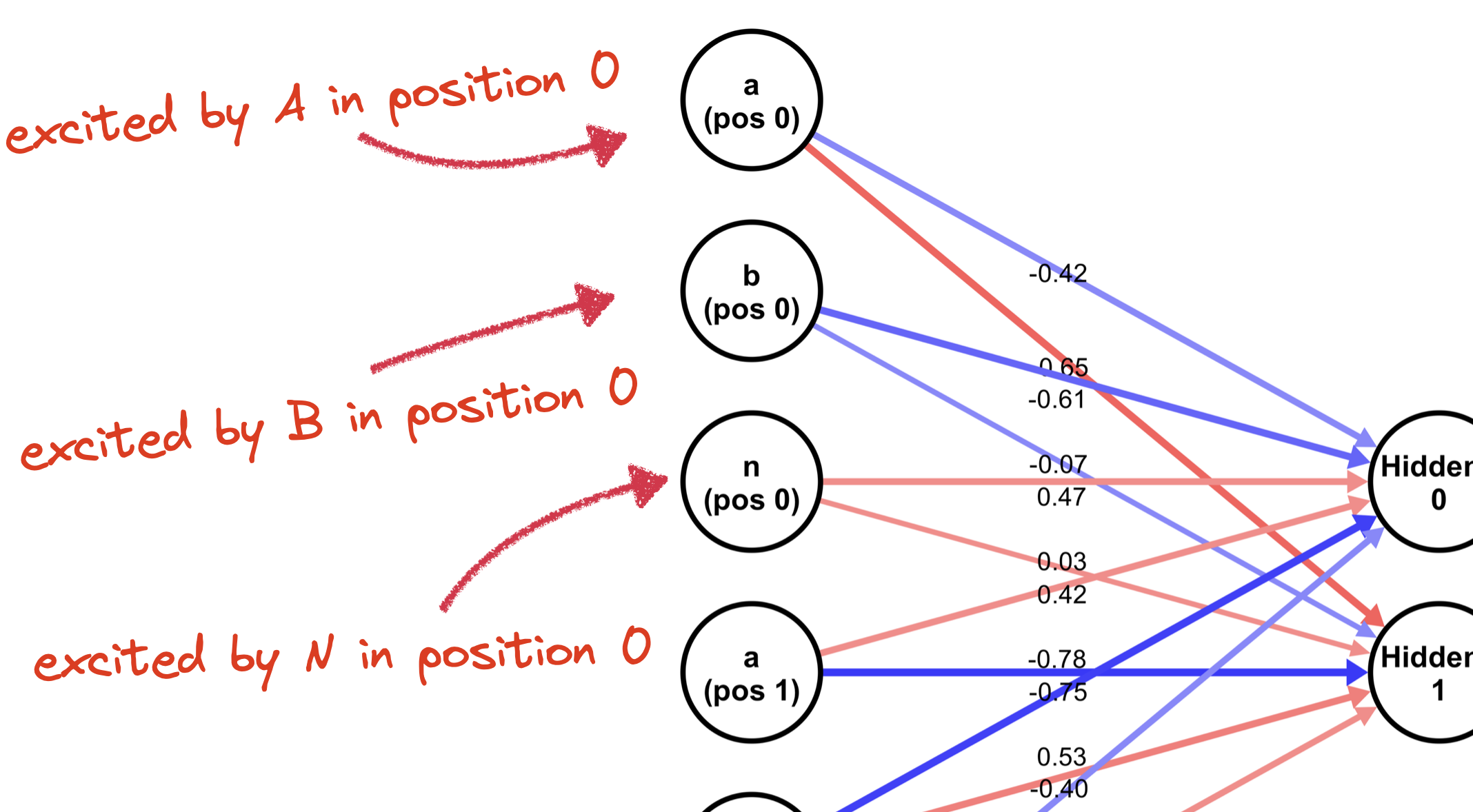 The neuron for “a” in position 1 is excited by “na” or “ba” but not “an”. You get the idea.