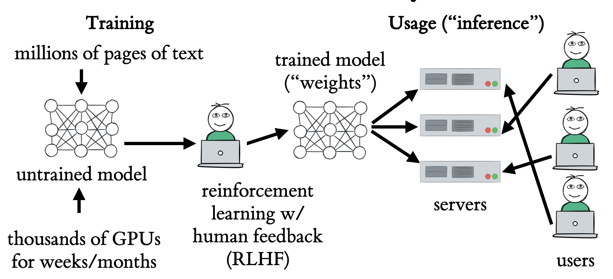 Here’s how to make an LLM. You start with a random, untrained model. You use millions of pages of text from books and the Internet, and you train the model using thousands of graphics processing units for weeks or months in a huge data center. Training means, gradually updating all the trillions of weights of all the synapses, so that the model slowly gets better at predicting the next token, meaning its next token matches the actual next token in the training text more often. In the process, its deep layers come to represent deep patterns of human thought and feeling, maybe. When you decide you’ve trained it long enough, you have lots of human workers interact with it and rate their conversations: this is reinforcement learning with human feedback, RLHF. The model’s weights get updated a bit more depending on which answers the testers like or dislike.