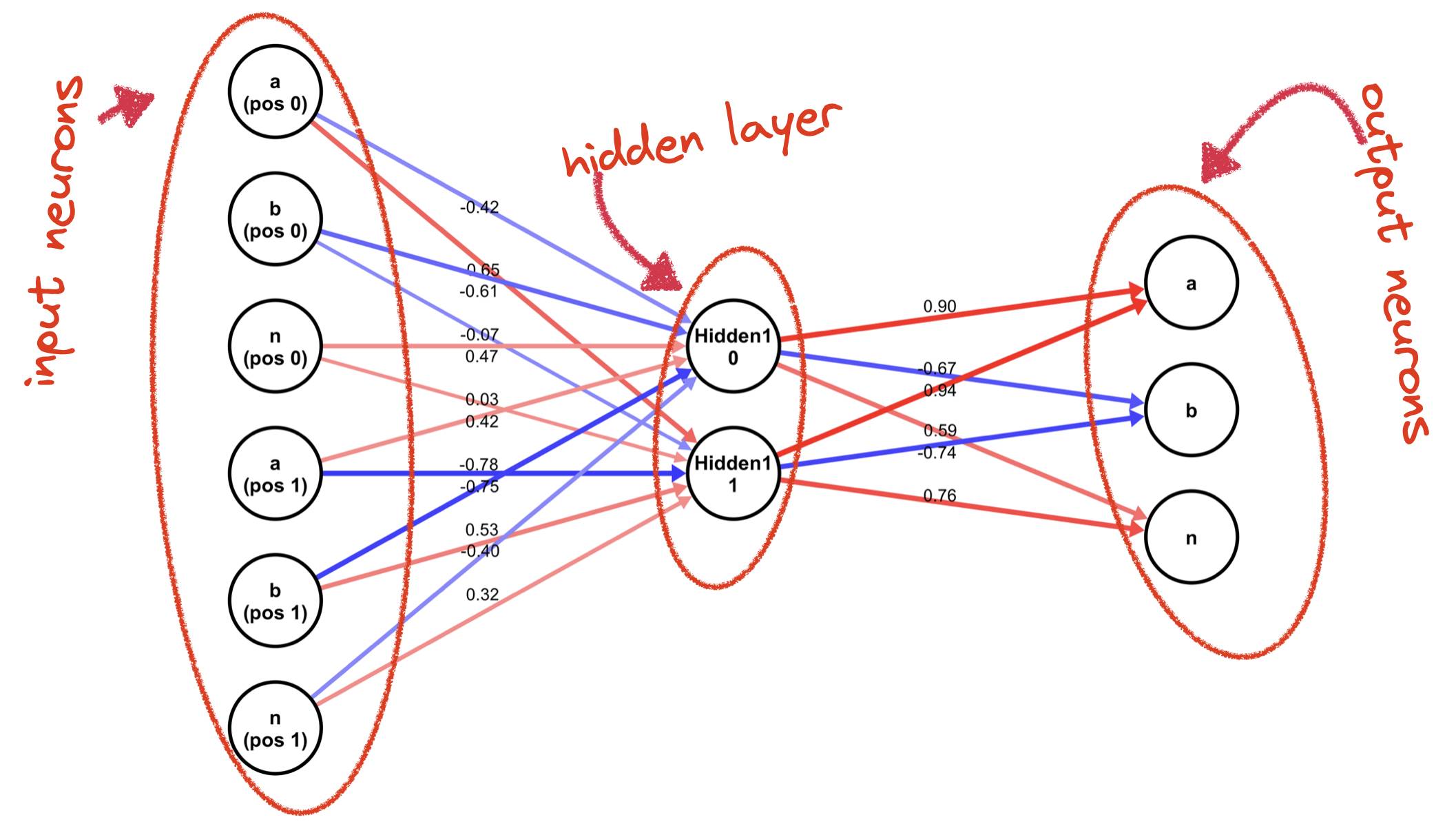The input neurons can only see the two most recent letters, so we say this neural net has a “context window” of 2 letters. Each input neuron has a specific job. The top-left input neuron is excited by an “a” in position 0, so it’s excited by “an” or “ab”, but not by “na”. Below it are the neurons excited by “b” or “n” in position 0.