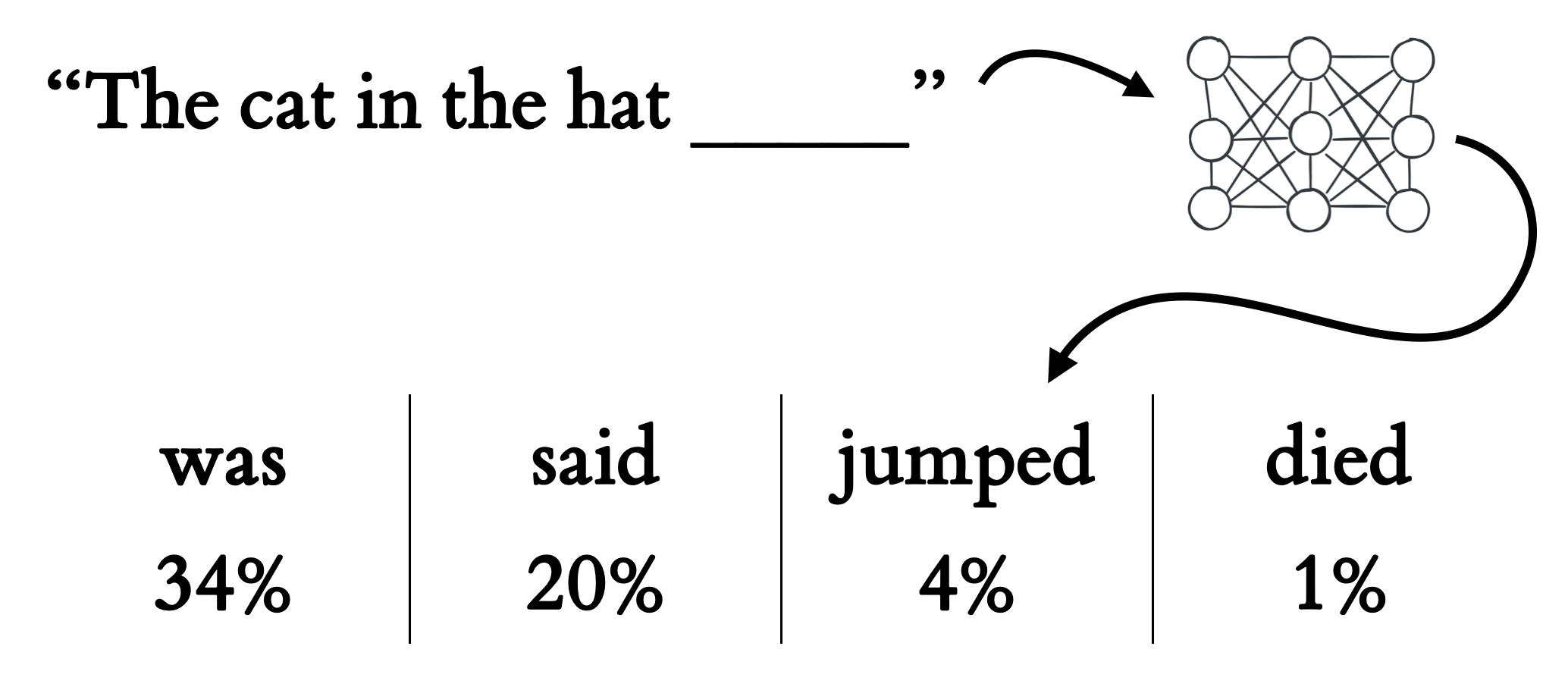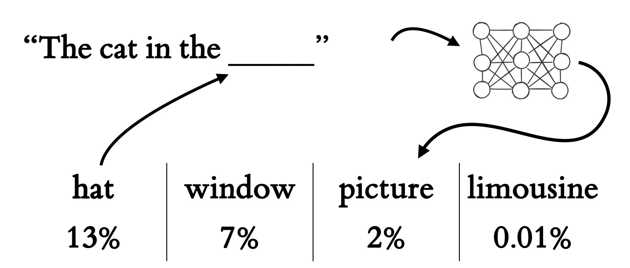 Here’s how text generation works. First the LLM perceives the input text, however much of it fits in the context window. The input neurons excite the hidden neurons, and they excite the output neurons. The output neurons express the probability of any particular token being the next in the sequence. So here, “hat” is most likely to come after “the cat in the”.