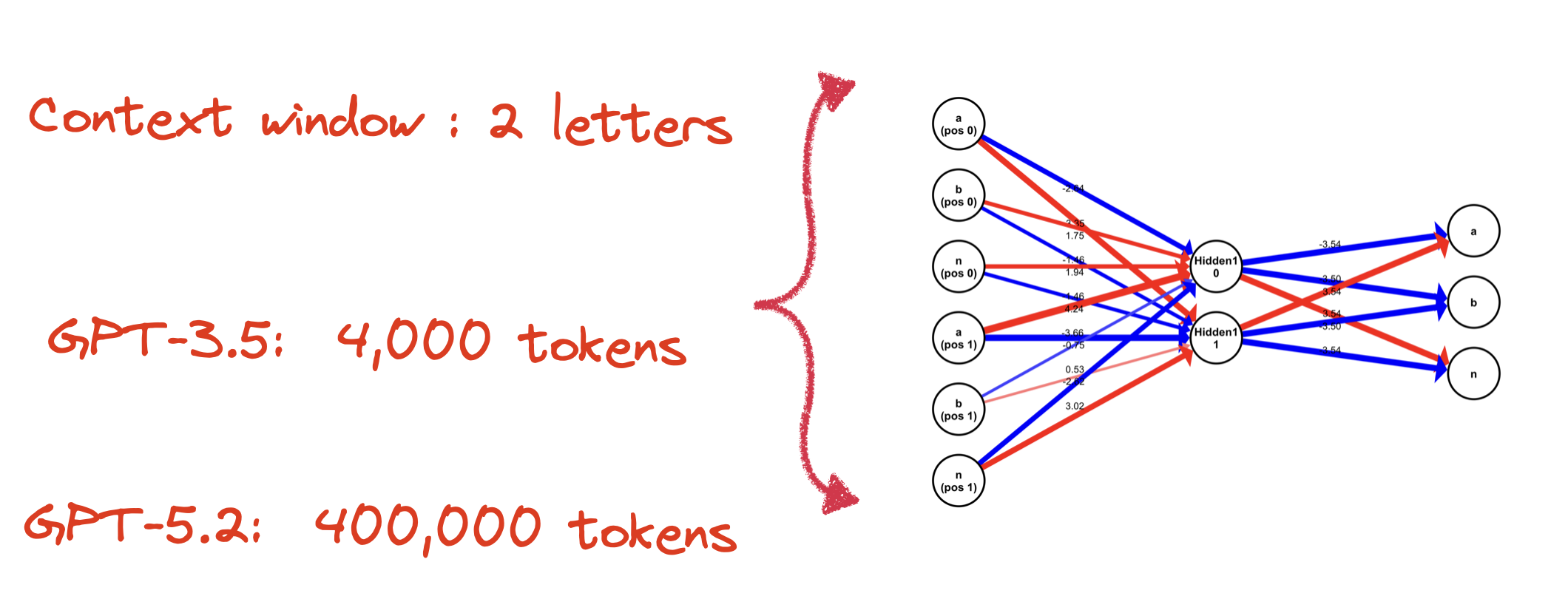Our network can perceive two letters at a time, that’s called the “context window” of two letters. GPT-3.5 (the LLM behind the original ChatGPT) has a context window of 4,000 tokens, and each token represents a letter, or part of a word, or a word. OpenAI’s latest model GPT-5.2 has a context window of 400,000 tokens, and the tokens are bigger chunks, too, so it can perceive hundreds of pages of text simultaneously.