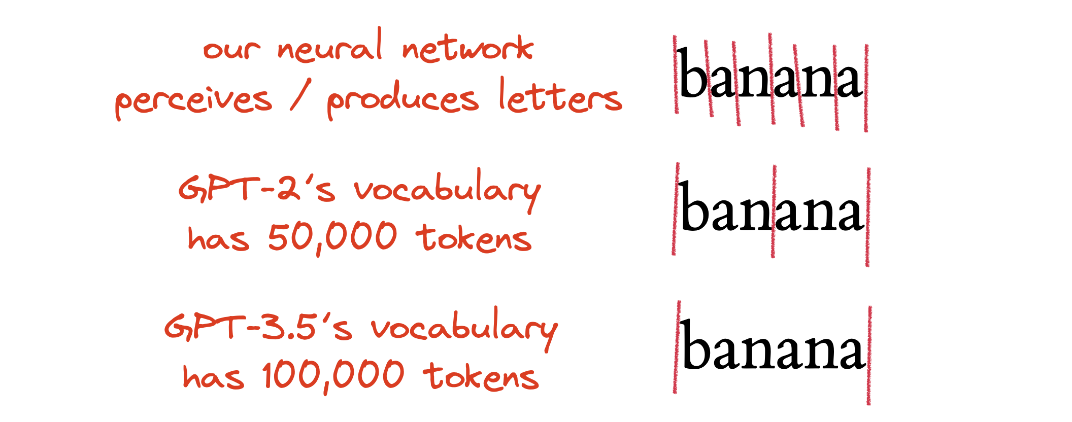 Large language models perceive tokens and predict the next token. Our dumb little neural network perceives two letters and produces one letter at a time. If you want to read and write large texts this is not efficient, it’s better to read and write whole words, or chunks of words. After all that’s what humans do, we don’t read “the” as T. H. E., we think of “the” as a single shape that we read and write; we forget about the letters. GPT-2 was a large language model created a few years ago, it recognizes 50,000 tokens, so it can perceive banana as two chunks, “ban” and “ana”. GPT-3.5 has 100,000 tokens and “banana” is one of those tokens, so it perceives the whole word as a single thing. Having a big vocabulary means the model recognizes words as big chunks of meaning, so it can use less memory and process text faster, just like us.