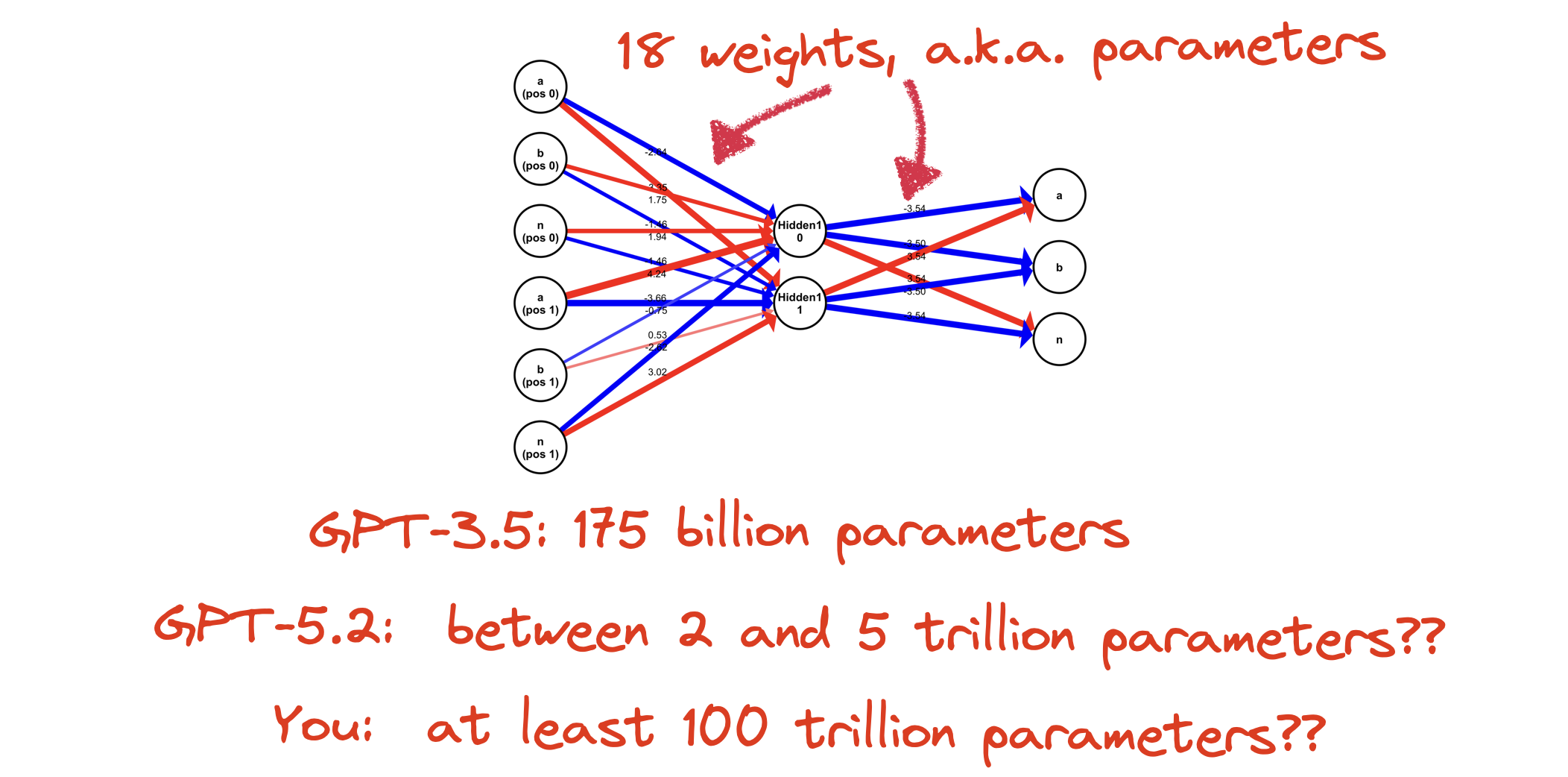 The connection strengths between neurons are called weights, or parameters. They are the secret sauce. Optimizing the weights is the outcome of training, that’s what the AI companies are building billion-dollar data centers to calculate. Our neural network has 18 parameters. OpenAI disclosed that GPT-3.5 has 175 billion parameters. Experts guess that GPT-5.2 has 2 to 5 trillion. For comparison, you have 100 to 1000 trillion synapses—neuroscientists are surprisingly unsure of this figure. Also, your synapses have more complex behaviors than synapses in artificial neural networks, so you’re probably thousands or tens of thousands of times more complex than GPT 5.2. On the other hand, GPT-5.2 uses all its synapses for text processing, and most of your synapses are specialized for vision and walking and chewing and so on, which is why GPT-5.2 is so good at text processing compared to you.