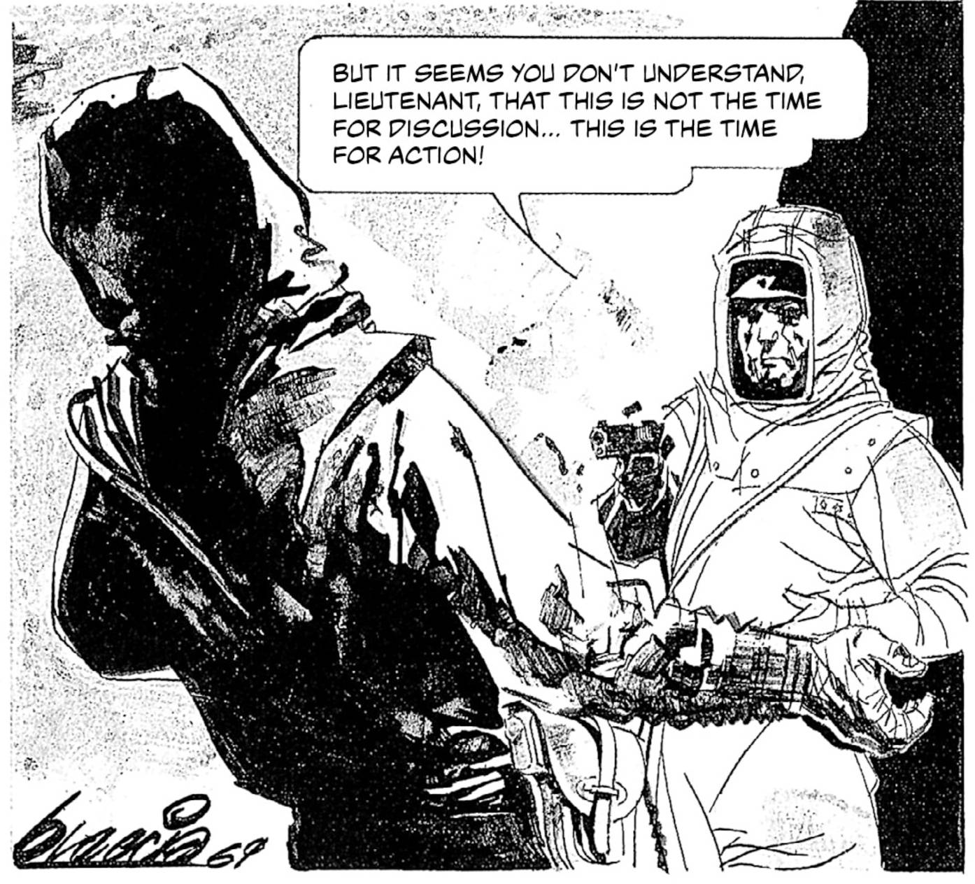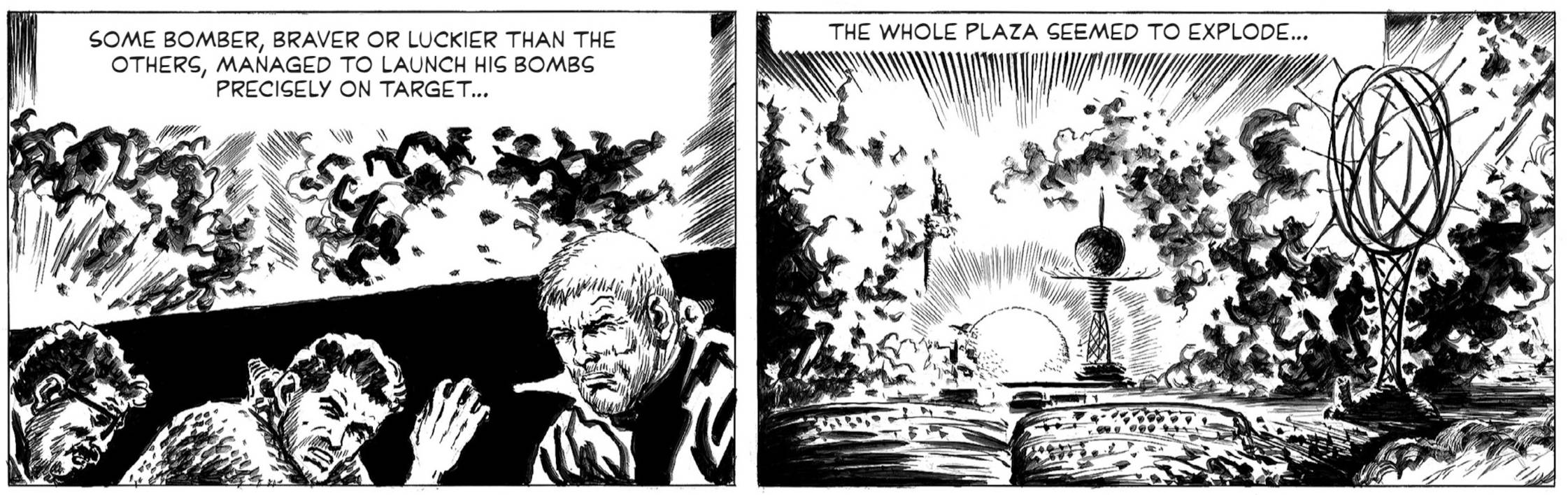 Oesterheld wrote the story in the aftermath of Juan Perón’s overthrow and an airstrike against a pro-Perón rally in Buenos Aires’s central square, which killed hundreds of civilians. I don’t know much about Argentina’s history, and I’m confused about Oesterheld’s opinion of Perón and the coup. Everyone has to agree that the bombing of the Plaza de Mayo was an atrocity, I assume. But in The Eternaut, it’s the good guys who bomb a plaza, trying to destroy the alien headquarters.