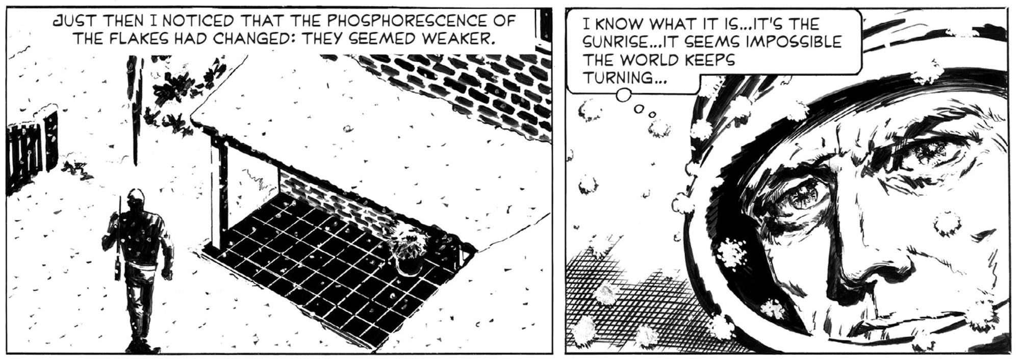 Eternaut 1969 alienated its audience. Oesterheld’s resentful politics and Breccia’s avant-garde art led to the series’s early cancellation. In the last few pages the comic rushes to its conclusion, summarizing the plot in a few paragraphs and some vague illustrations. The work is a sad failure, comprehensible or interesting only to an Eternaut completist.