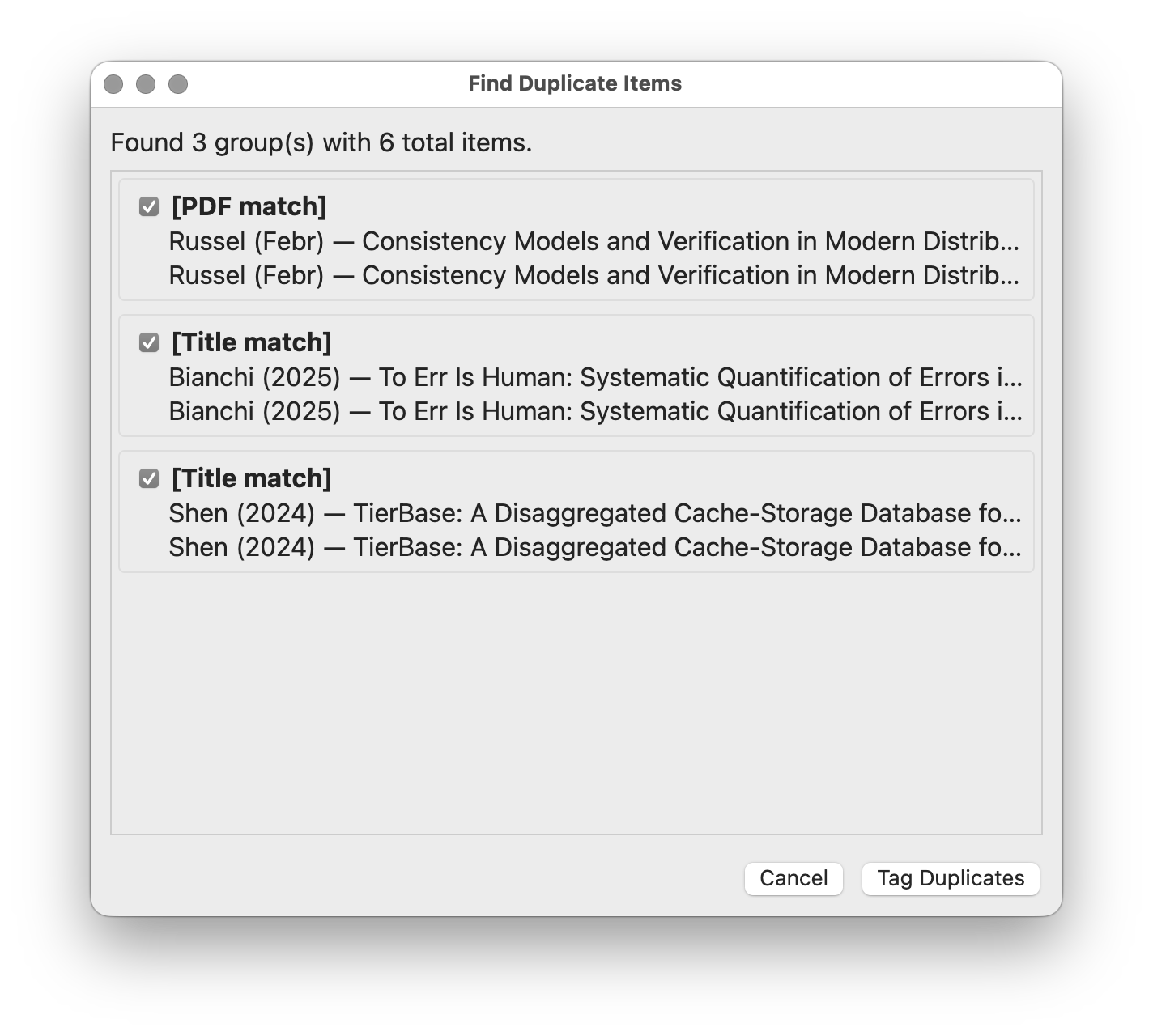 To use it, install the plugin from the latest release, then go to Tools → Find Duplicate Items. The plugin scans your library and shows you groups of duplicates. Uncheck any groups you want to spare, then click “Tag Duplicates.” The plugin tags the parent items with “duplicate”—it doesn’t delete anything, because I don’t trust the plugin and neither should you. The plugin then shows you your duplicate-tagged items.